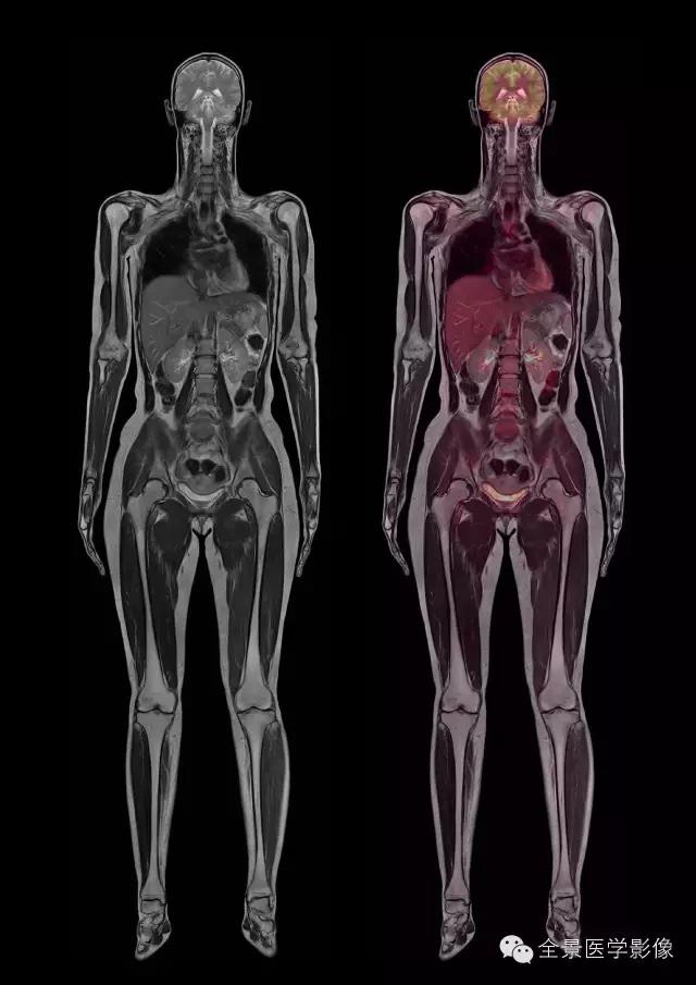 左側(cè)為高精度磁共振掃描圖像,右側(cè)為PET-MR(研究型)掃描融合圖像