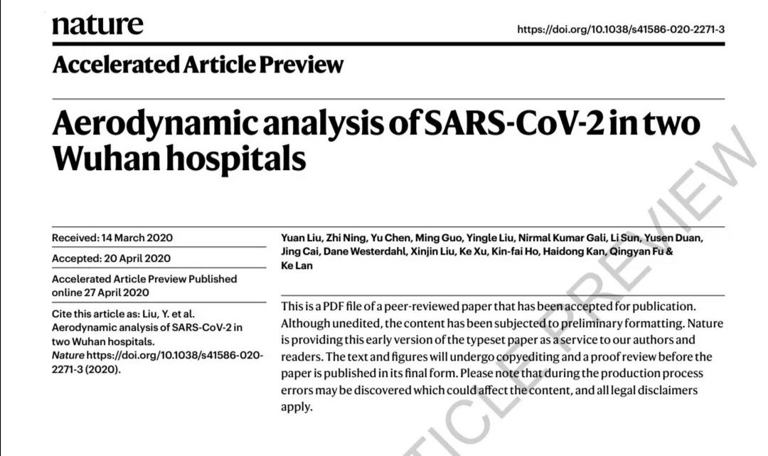 4月27日,Nature(《自然》)在線發(fā)表武漢大學病毒學國家重點實驗室主任藍柯教授領銜的抗疫科技攻關團隊的最新研究成果,論文題為"Aerodynamic Analysis of SARS-CoV-2 in two Wuhan Hospitals"(《武漢兩所醫(yī)院的新冠病毒氣溶膠動力學分析》),并作為亮點論文(Featured article)進行推薦.