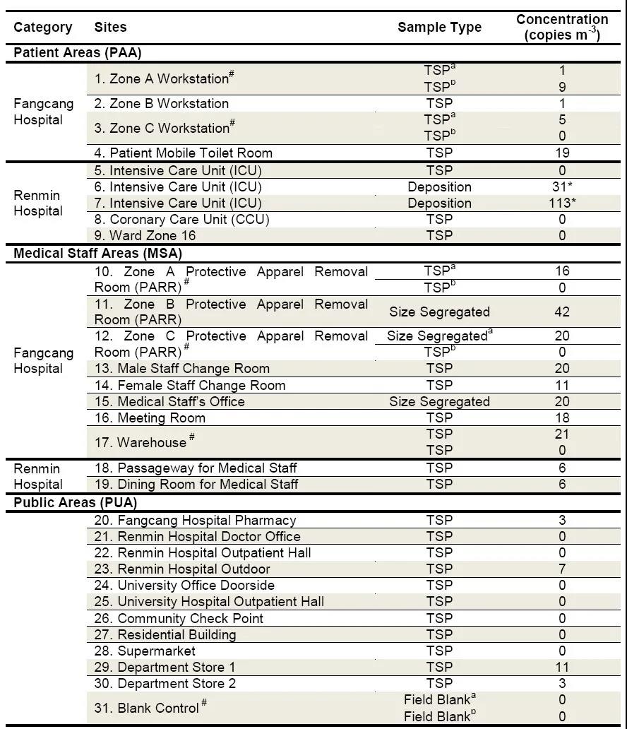 △ 醫(yī)院和公共環(huán)境各采樣點的新冠病毒載量(拷貝數(shù)/立方米空氣)