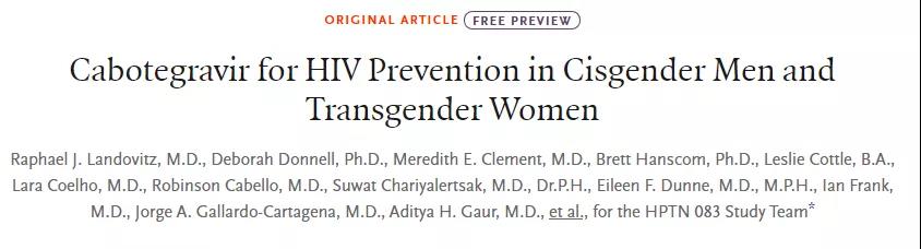 相關研究結果以Cabotegravir for HIV Prevention in Cisgender Men and Transgender Women為題發(fā)表于《NEJM》雜志上。