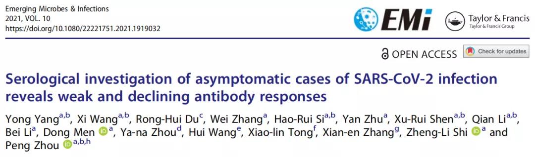 然而,當前大多數(shù)研究都集中在臨床患者上,對無癥狀感染者的報道卻較少,對無癥狀感染病例的免疫保護強度和持續(xù)時間目前也尚不清楚。2021年5月18日,石正麗、周鵬等人在《EmergingMicrobes&Infections》雜志發(fā)表文章:Serological investigation of asymptomatic cases of SARS-CoV-2 infection reveals weak and declining antibody responses。