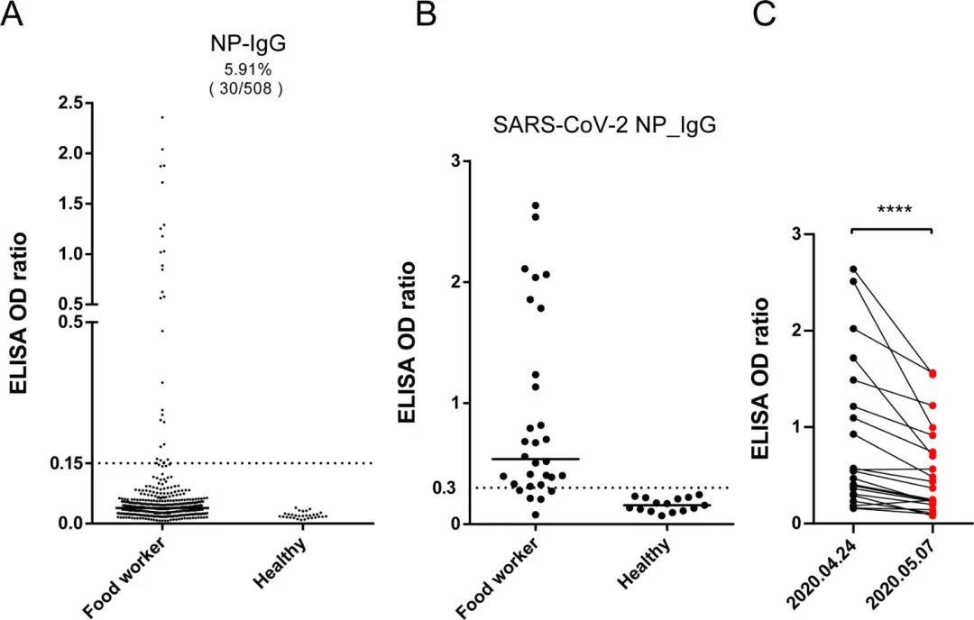 數(shù)據(jù)顯示,508 名受試者中有30 名(5.91%),其血清中攜帶病毒NP蛋白抗體,表明他們可能感染了SARS-CoV-2,但無癥狀。值得注意的是,在調查時,他們中沒有一個是病毒核苷酸陽性的。