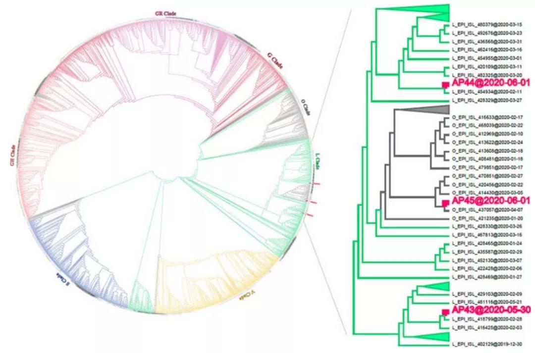 為確定無癥狀人群的免疫反應特征,研究納入了24名在流行病學調查中RT-PCR檢測呈陽性、但在前14天內無任何相關臨床癥狀的感染者。從2020年5月30日(AP43)或2020年6月1日(AP44和AP45)的3名無癥狀感染者的痰樣本中獲得了3個病毒的全長基因組。利用從GISAID下載的1927個SARS-CoV-2基因組和本研究獲得的3個基因組進行系統(tǒng)發(fā)育分析。3個基因組均與早期L譜系或其他相關分支相近,其中2個基因組與2月份測序的病毒基因組(AP43和AP44)關系密切,第三例與2020年4月獲得的一個基因組相關(AP45)。