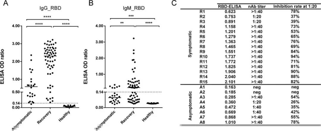 另外,研究比較了從感染中恢復的無癥狀和有癥狀患者之間的病毒特異性中和/非中和抗體反應。采集了60名有癥狀的患者的血清樣本,這些患者在初次感染后2-3個月康復,并且病程與無癥狀受試者相似。