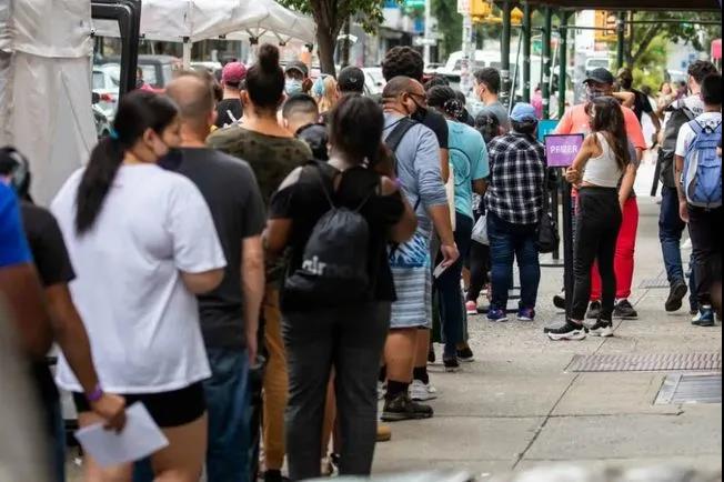 圖片說明:當?shù)貢r間8月23日,美國紐約一個新冠疫苗接種點外,人們排隊等候接種。/新華社