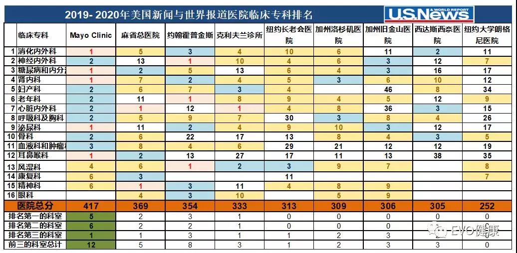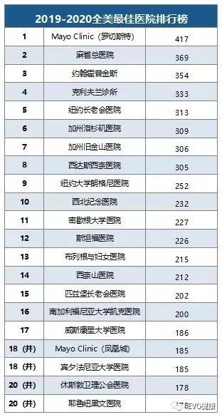 7月30日,《美國新聞與世界報(bào)道》公布了2019-2020年度最佳醫(yī)院排行榜(U.S. News & World Report's Best Hospitals),截至目前,榜單已經(jīng)連續(xù)發(fā)布了30期??偱琶那叭追謩e是梅奧診所、麻省總醫(yī)院和約翰霍普金斯醫(yī)院,其中梅奧診所連續(xù)第四年成為總榜第一名。